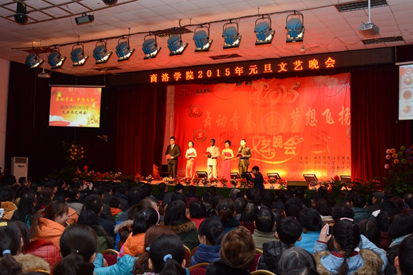 马蹄留胜迹,羊毫谱新歌。12月30日晚,我校2015年度元旦文艺晚会在大学生活动中心隆重举行。商洛市副市长刘荣贤,校党委书记张景书、校长刘建林、党委副书记左晓民、纪委书记王思怀、副校长魏书堂,商洛市教育局局长胡栋梁、共青团商洛市委书记曹艳萍、商州区政府副区长杨俊芬,商洛供电局、中国银行商洛分行、中国建设银行商洛分行、中国邮政商洛分公司、中国移动商洛分公司、中国联通商洛分公司、中国电信商洛分公司、商洛市剧团、中国移动商州分公司有关领导同师生们一起观看了演出